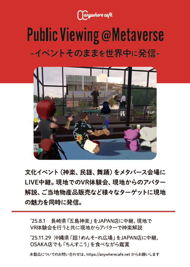 文化イベント(神楽、民謡、舞踊)をメタバース会場にLIVE中継。現地でのVR体験会、現地からのアバター解説、ご当地産品販売など様々なターゲットに現地の魅力を同時に発信。